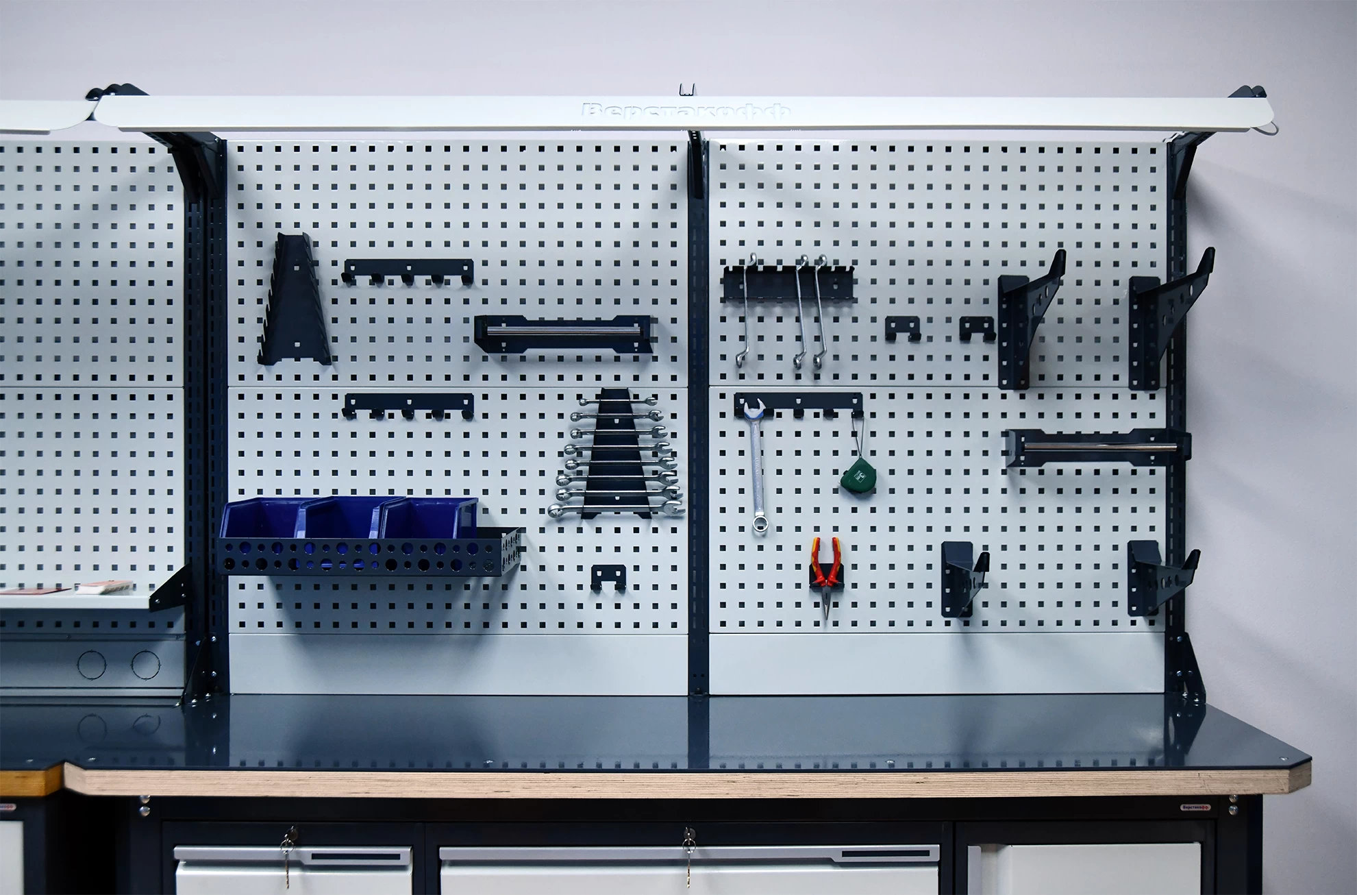 По желанию верстак дополнительно оборудуется полочками, навесными шкафами, держателями, крючками, блоками розеток и другими приспособлениями для комфортной организации рабочего места.